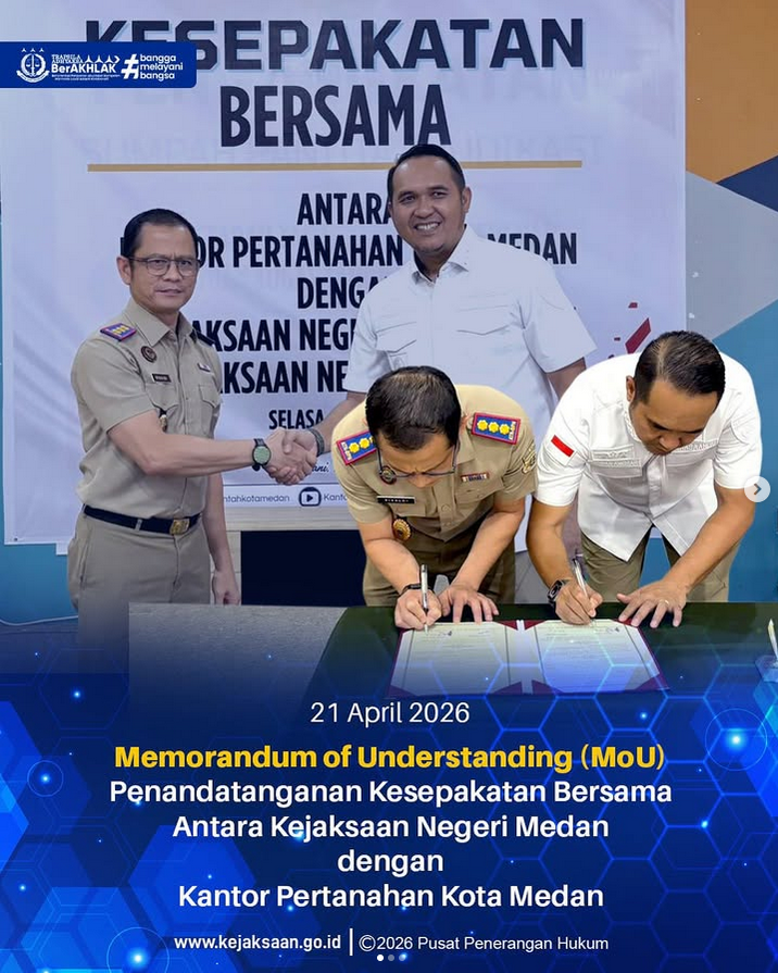 Memorandum of Understanding (MoU) tersebut ditandatangi langsung oleh Kepala Kejaksaan Negeri Medan RIDWAN SUJANA ANGSAR, S.H., M.H. dan Kepala Kantor Pertanahan Kota Medan RIVALDI, S.SiT., M.M., Q.RMP.